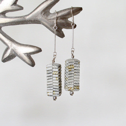 Gold, silver and white folded Japanese paper hangs from sterling silver chains and hooks to create a dangling pair of fashionable earrings! These hang about 2 inches from the bottom of the hook. The paper is protected with a special coating so they will hold up in case you get caught in the rain. Just make sure to not submerge them in water.