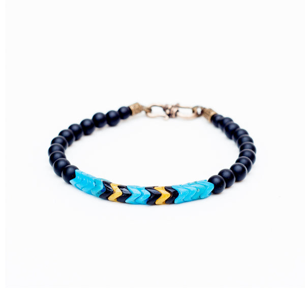 Black Onyx and vintage African Snake bead Bracelet Flat 6mm Onyx beads with Bohemian vintage African snake beads (Aqua) make up this bracelet. Final touches are hand forged solid brass clasp. Fits 7"-7.75."