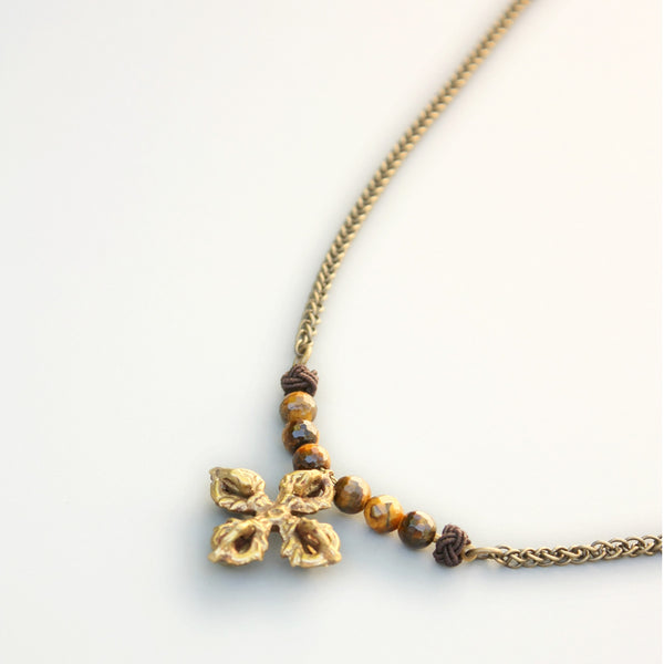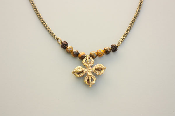 Brass chain with faceted 6mm tiger Eye beads nicely weighted down by the Buddhist gold plated ceremonial cross. Chinese hand knotted beads attach to chain. 21" or 30" Long.