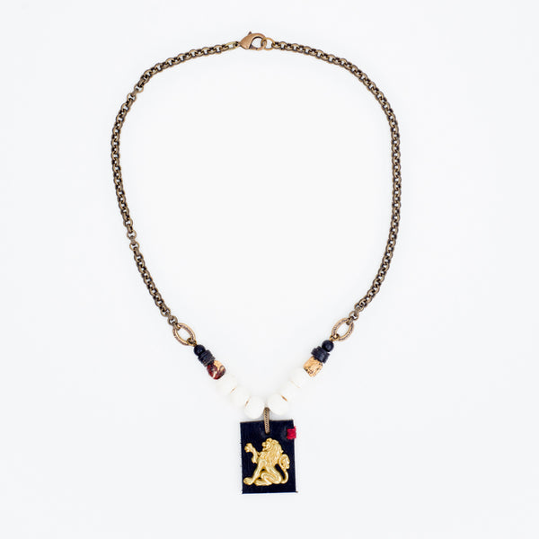Three dimensional solid brass Roaring lion on thick stitched leather is the centerpiece of this necklace. Tibetan Yak bone and Gold leaf Buddhist prayer monk beads on each side. African Coco Heshi discs and Ebony wood attach to gold plated etched rings. Piece is finished with Heavy-duty brass Rollo chain and brass clasp. Hand made in our studio, USA. (7 Red Stitches)