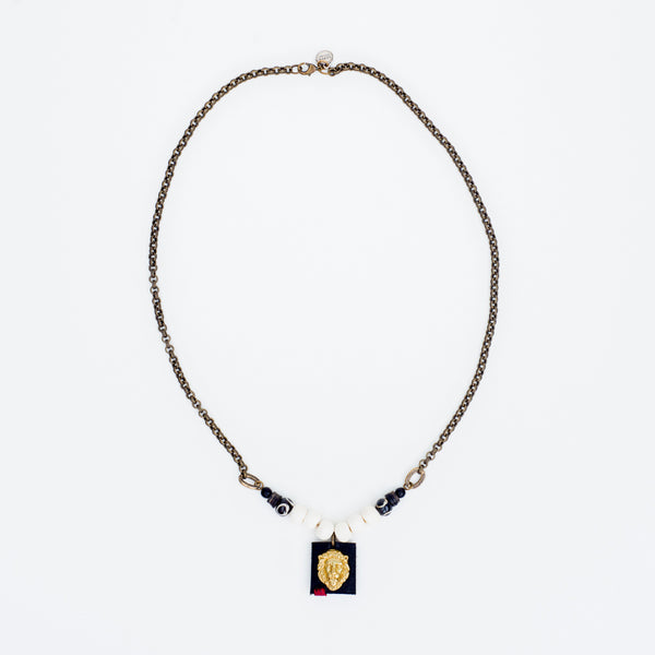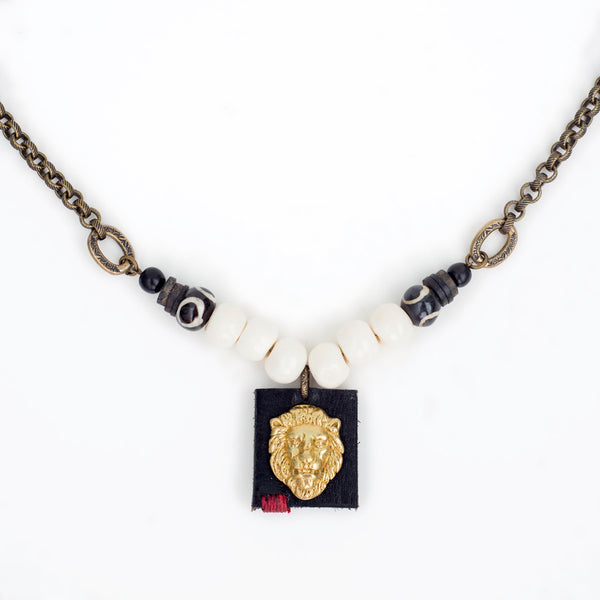 Three dimensional solid brass lion's head on thick stitched leather is the centerpiece of this necklace. Tibetan Yak bone and African Batik Bone on each side add dimension and depth to this Black and white piece. African Coco Heshi discs and Ebony wood attach to gold plated etched rings. Piece is finished with Heavy duty Rolo chain in antique brass and brass clasp. Can be made longer or shorter, contact us for a quote. Unisex, Hand made in our studio, USA. (7 Red Stitches.) 21" or 30" Long.