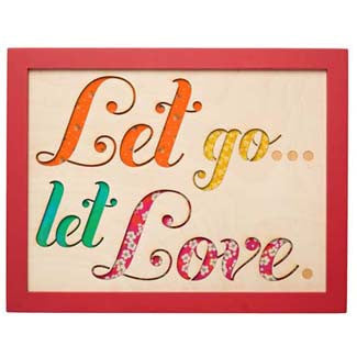 This exciting Text Message Art showcases words that matter. Handcrafted from birch wood and textiles by fiber artist and health coach Georgianne Holland, the words are laser cut into the birch wood and four colorful fabrics peek through to give a 3D look to this hip word art! The frame is a smooth-finish hard wood painted bright red and is ready to hang. No two are exactly alike: fabric variations. 13”x10.5” Spread a little love! Georgianne Holland, ©2012 Match your home decor! See all of your frame color choices below.