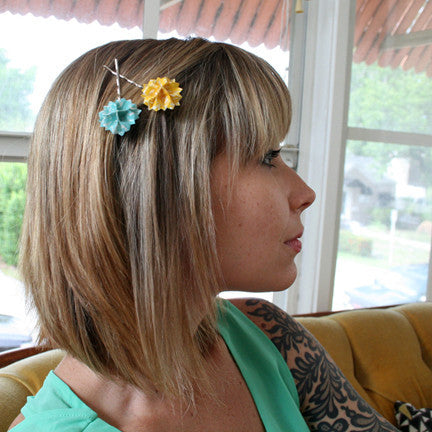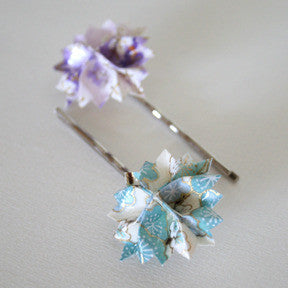 Set of 2 origami flower hair pins. One has a light blue floral pattern and the other has a light purple floral pattern. The flowers are made by hand from a tiny piece of origami paper. Each flower is coated with many layers of sealant to harden them and keep them safe in case you get caught in a drizzle. Just be careful to not submerge them in water.