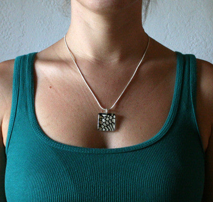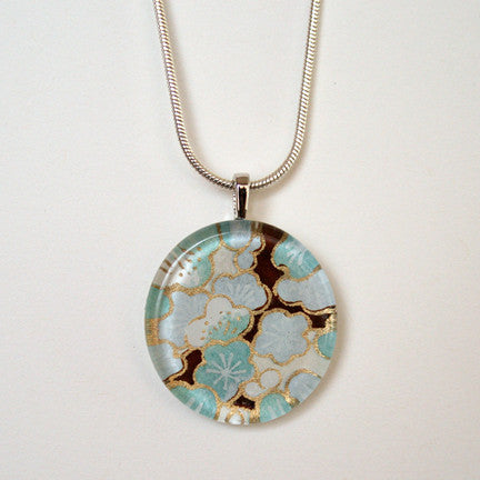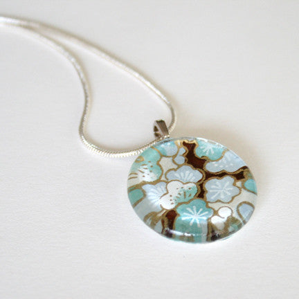 This pendant is handmade from an oval glass tile and blue and white floral Japanese paper. The pendant is attached to a sterling silver plated bail and hangs from an 18" sterling silver plated snake chain. It is coated with resin on the back so the paper is protected from moisture.