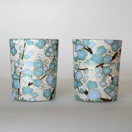 Set of 2 candle holders covered in a beautiful light blue floral patterned Japanese paper. The glass is approximately 2" in diameter and 2 1/2" tall. Works perfectly with a tea light inside which illuminates the paper from behind.